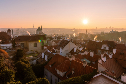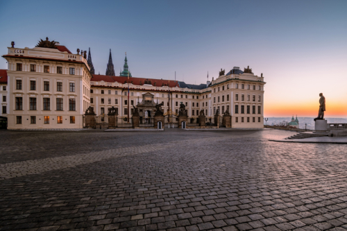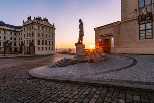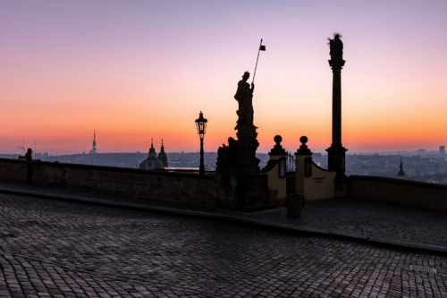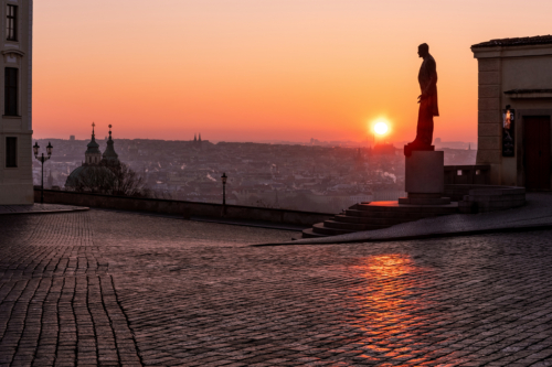 The view from the Prague Castle ramp in the lower part of Hradcany Square will completely enchant you with a magical atmosphere at sunrise.